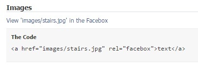 به عنوان نمونه همانطور که میبینید، برای استفاده از این پلاگین باید به تگ a مورد نظر، rel=facebox داده شود.
