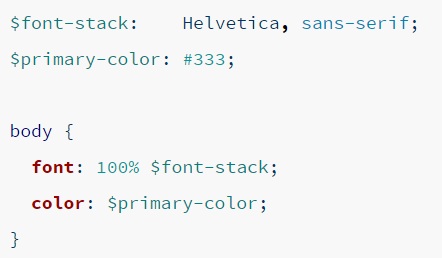 تعریف متغیر در SASS مانند PHP با $ انجام میشود. کدهای SASS در نهایت کامپایل و به Css تبدیل میشوند. در کد Css تولید شده بعد از کامپایل، مقدار متغیرها در جای خود قرار خواهند گرفت.